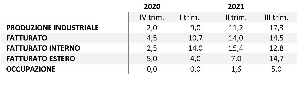 Nel trimestre la produzione ha registrato un aumento del 17,3%, sullo stesso periodo dell’anno precedente. L’industria reggiana ha, infatti, continuato a beneficiare dell’andamento sostenuto della domanda internazionale; a questo si è aggiunto un rafforzamento della domanda interna. Il recupero produttivo ha riguardato tutti i settori di attività.
